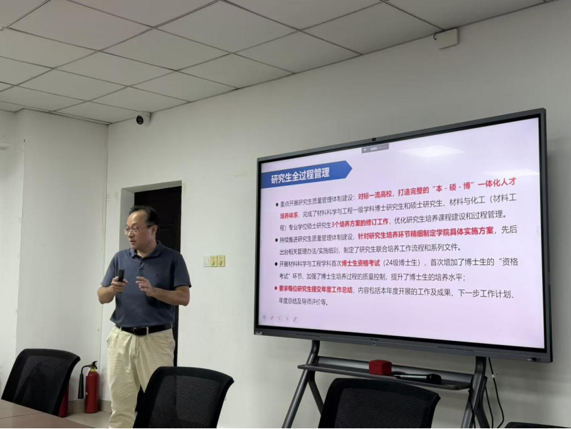 林仕伟副院长以“立德树人,协同创新,实现导师能力和研究生培养质量双提升”为主题作了培训报告。要求导师要学为人师,行为世范,做学生成长的引路人,介绍了材料学科的基本情况和研究生培养全过程及质量管控体系等方面的内容,为研究生导师提供了一场内容丰富、指导性强的学习交流会。他指出“学为人师”要求导师们不断提升自身学术水平和道德修养,以深厚的学识魅力和人格魅力感染学生;“行为世范”则要求导师恪守学术规范,以身作则,为学生树立标杆。导师应努力成为“大先生”,做学生为学、为事、为人的示范,真正成为学生科研道路上的“引路人”和人生旅程中的“灯塔”。此外,还通过详实的数据和图表,全面展示了我院研究生的规模结构、学科布局以及研究生培养全过程的规范管理。当前我院研究生队伍规模稳步增长,生源质量持续优化,毕业就业率不断提高,这对导师的指导能力提出了更高要求。