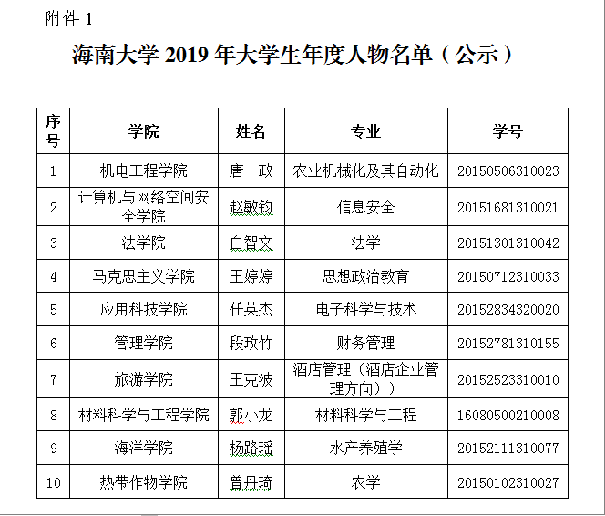 经学生自荐,学院评选,学生工作处(部)复核,学校初审工作小组初审以及校内外专家组复评,最终评定10名同学为海南大学2019年大学生年度人物,我院2016级研究生郭小龙获此殊荣,且是唯一一名获此殊荣的研究生。