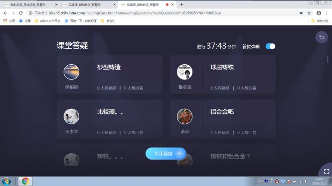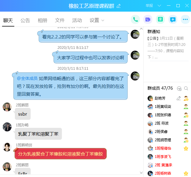 线上课程,在讲课过程中根据正在讲授的内容,灵活机动的提出问题,学生们非常积极的在课堂答疑功能区进行互动讨论。遇到同学举手的,即时开通师生互动语音交流。极个别学生因网路突然不流畅导致暂时不能在平台发言的,也及时通过qq课程群与同学们交流互动。 学生反响很好,觉得参与感很强,体验非常好。有学生留言说整个过程能被高度吸引,不会走神。