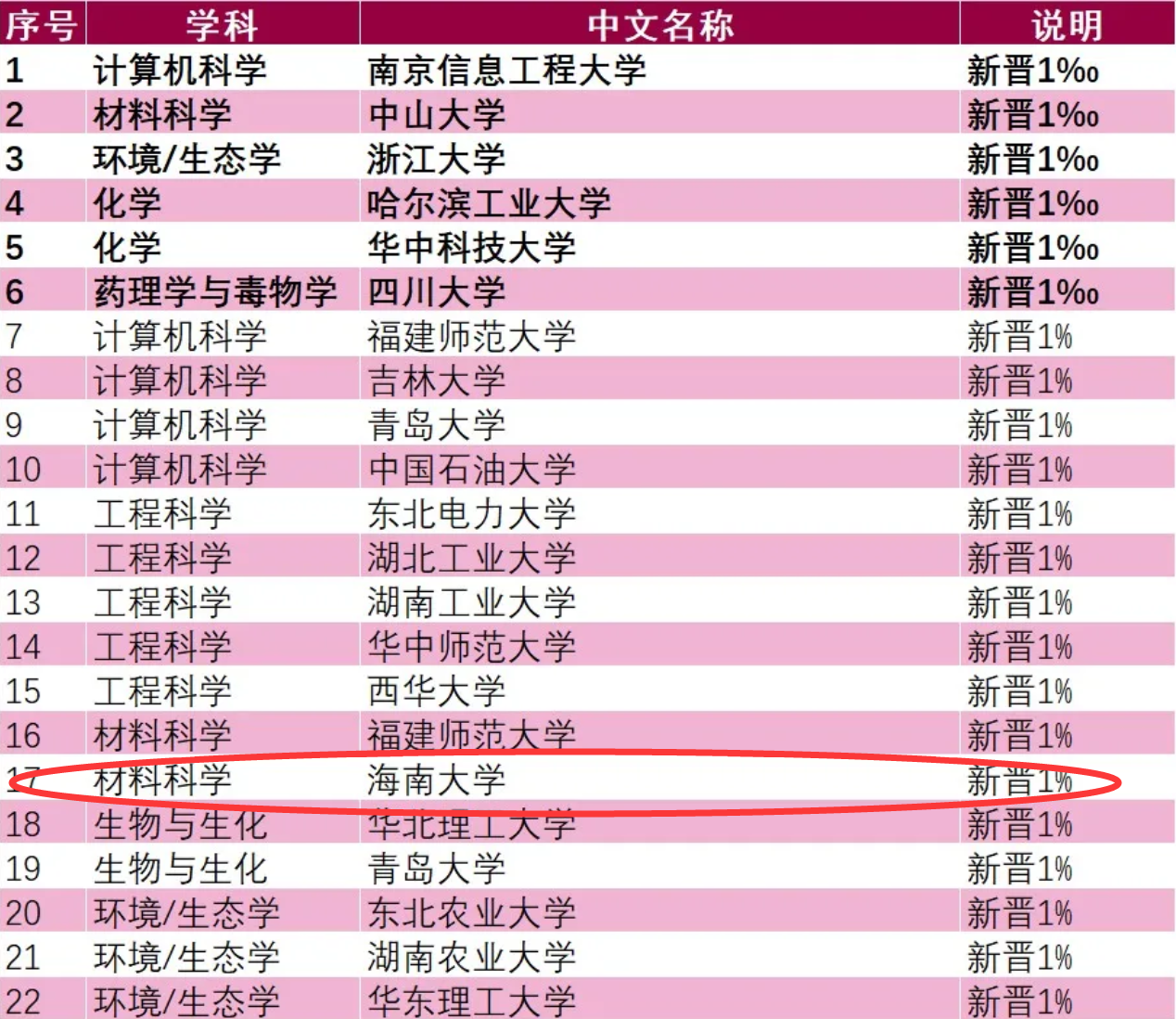 ESI是基于科睿唯安公司(原汤森路透)Web of Science(SCIE/SSCI)所收录的全球12000多种学术期刊的1000多万条文献记录而建立的计量分析数据库,是衡量科学研究绩效、跟踪科学发展趋势的基本分析评价工具。一个学科是否进入ESI前1%,是衡量该学科是否是世界一流的重要指标之一,也是衡量一所大学学科发展核心竞争力的重要指标之一。材料科学学科进入ESI全球前1%,表明我校在学科建设方面取得较大成效,这将极大促进海南大学推进建设世界一流学科和国内一流大学。