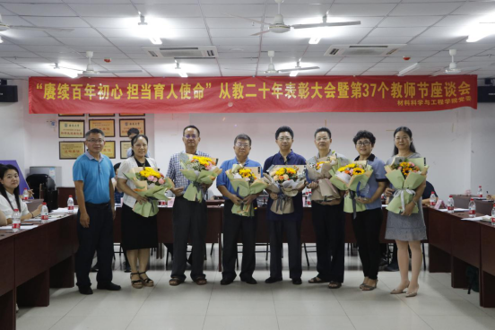 会议学习了海南大学“十佳好老师”短片,对“从教二十年”教师进行表彰。学生代表为“从教二十年”教师代表献花,胡先文书记为教师代表颁发奖章。