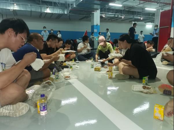 图二:支援陵水县抗击疫情青年志愿服务海南大学志愿者工作后席地用餐,左一为虞培军。
