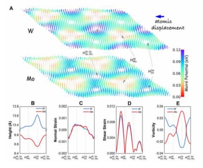 (A) 旋角为2.65°的WSe2/MoSe2 双层异质结。其中莫尔电势的大小由不同的颜色所代表。沿莫尔单胞对角线方向的 (B) 晶格起伏变化图,(C) 正应变分布图,(D) 切应变分布图,和 (E) 原子位移涡量分布图(逆时针旋转定义为正)。