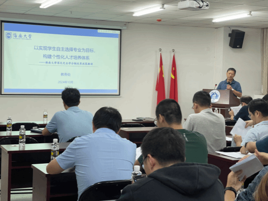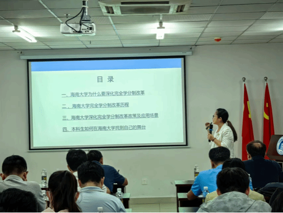 宣讲会上, 李玉凤副处长从海南大学为什么要深化完全学分制改革、海南大学完全学分制改革历程、深化完全学分制改革政策及应用场景等方面进行了全面阐述和详细解读。深化完全学分制改革是学校目前重点工作之一。完全学分制改革坚持以人为本,尊重学生的主体性和差异性,通过修订人才培养方案、深化学业评价体系改革、创新教学模式、推进教育数字化建设等,给予本科学生四年中七次自主选择专业的机会,提升学生的自主学习能力,增强其综合素质和实践能力,为未来的职业发展奠定坚实基础。同时,通过完全学分制改革促进学校合理配置教学资源,实现教育资源的优化配置。