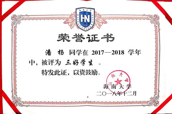 热爱生活,激发潜力。2016年入学后她加入海南大学演讲与口才协会,成为了策划部的一名干事,并于第二年留任编辑部担任部长一职,获得了“优秀干事”、“优秀会员”称号。2018年她和同学一起参加了“互联网+”和“创青春”大赛,分别获得校内赛金奖和银奖荣誉。2019年5月,她带队参加了“全国大学生节能减排社会实践大赛”获得校级二等奖。