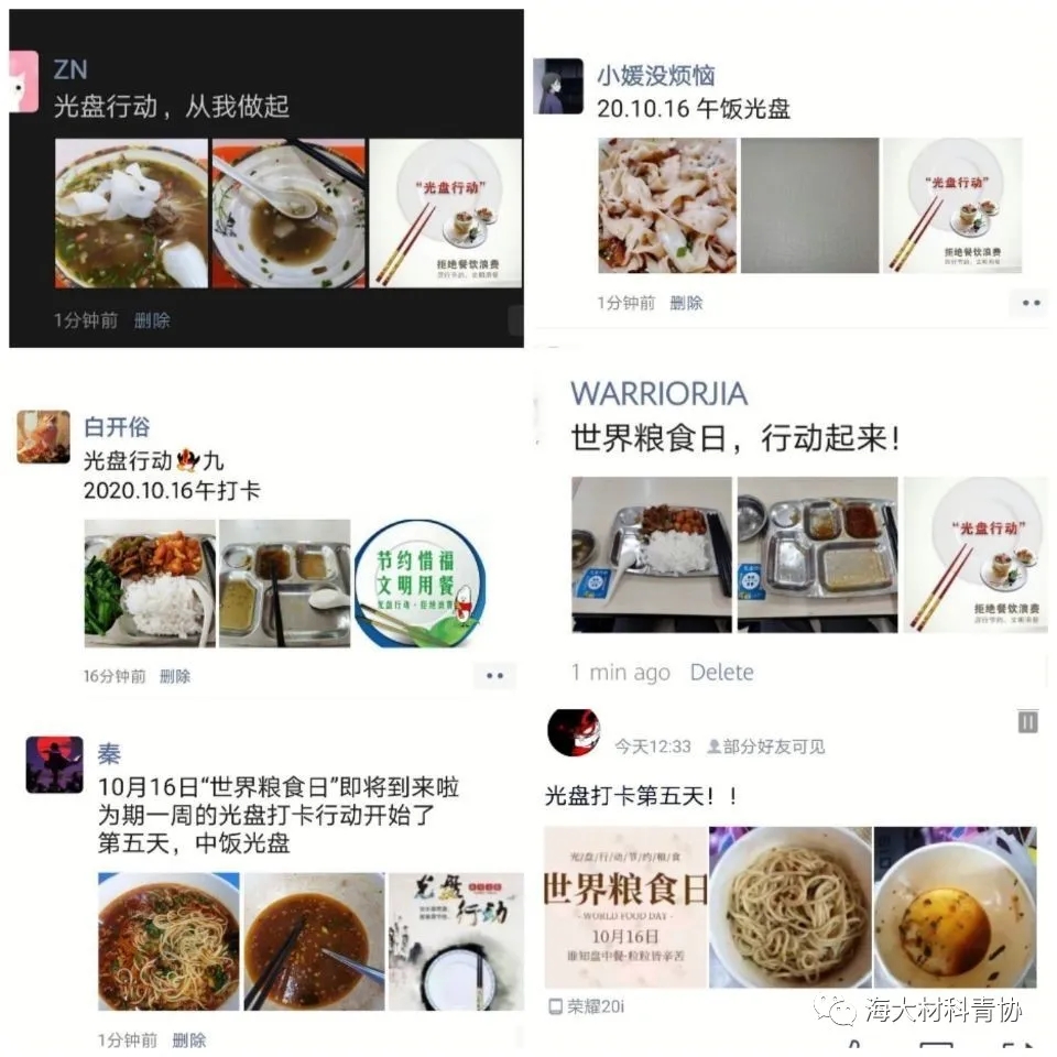 10月10日,青协发布关于本次“惜粮有你·材有未来”的活动内容,并由各班班委传达到班级内,同学们收到消息后踊跃参加。在活动期间开展“晒光盘”活动,同学们每天中午和晚上在QQ空间或朋友圈晒出自己的光盘,并为之附上充满正能量的文案,随后将截图发送给负责人记录。在为期一周的活动后,同学们可以根据打卡次数兑换小奖励。
