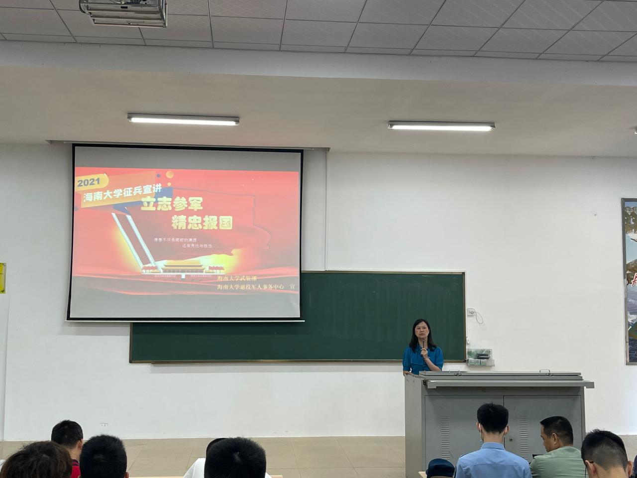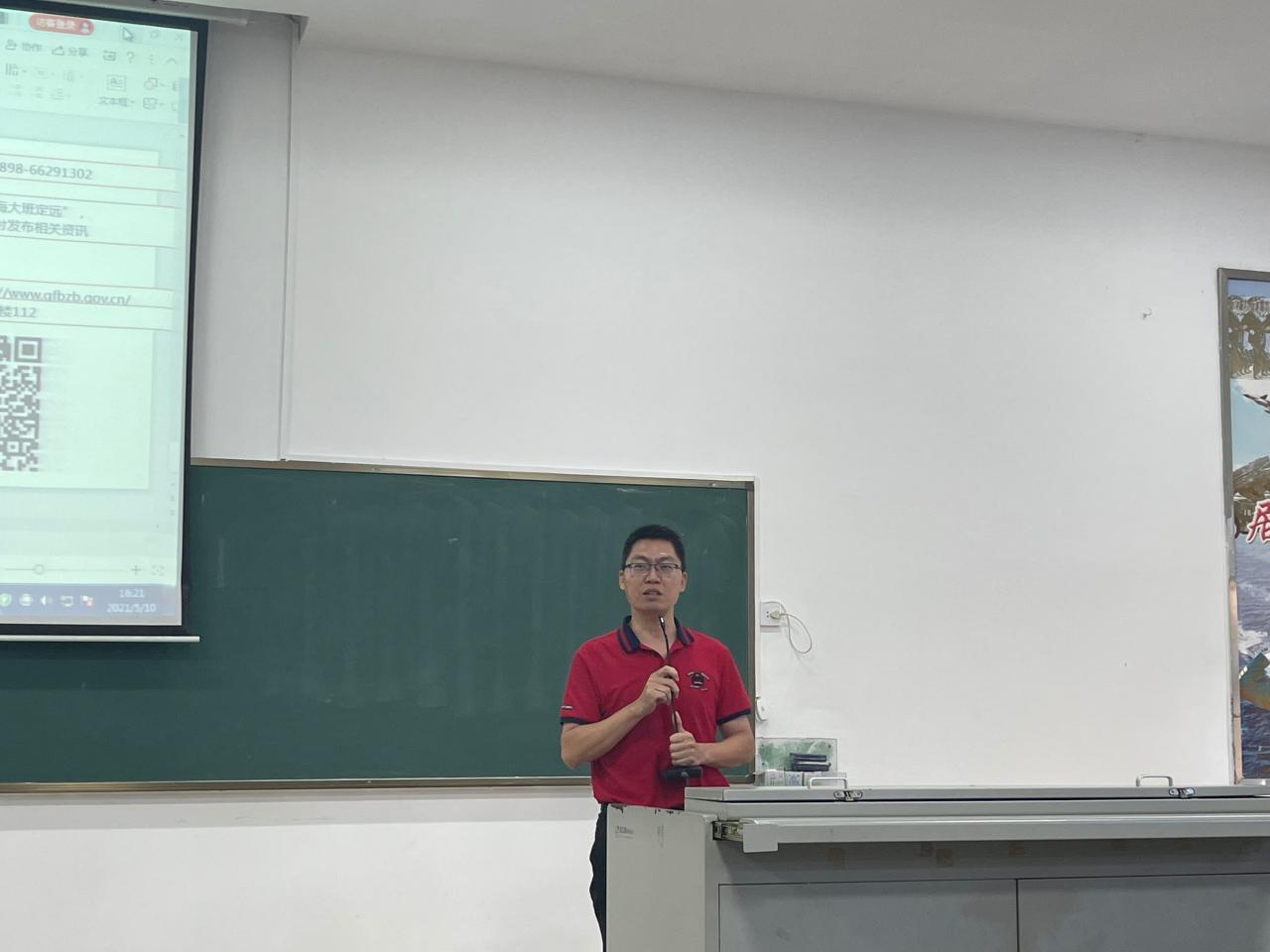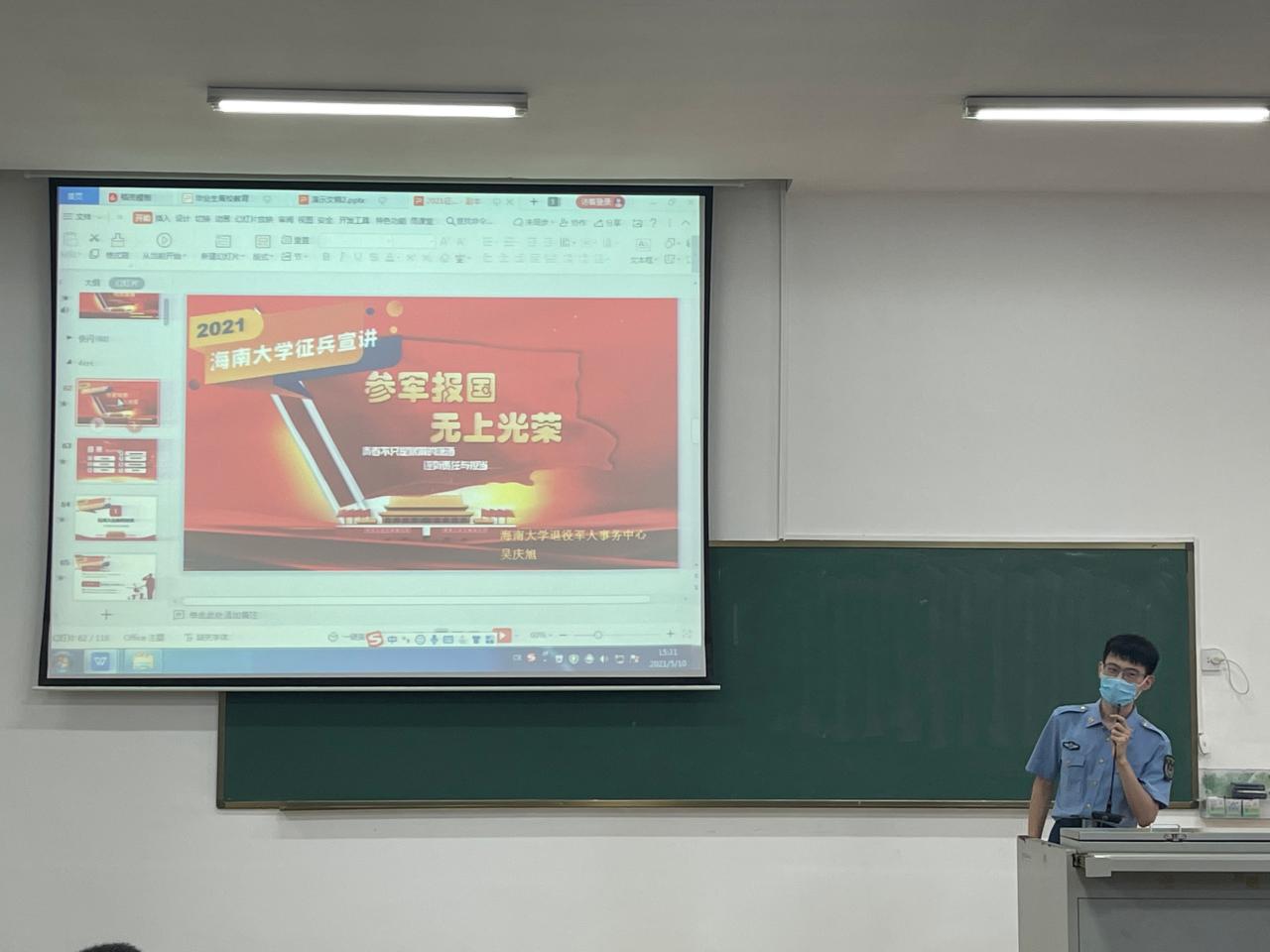 为加强征兵政策宣传,做好2021年大学生应征入伍工作,我院于2021年5月10日在1教T101召开了2021年征兵动员大会。出席此次大会的领导嘉宾有:美兰区武装部副部长冯电春、学校人民武装部副部长周邦华、学院党委副书记周郭军,学校人民武装部军事科科长叶沪伟。大学生征兵宣讲团学生代表、辅导员和2017级全体本科生及研究生参加了大会。学院党委副书记周郭军主持会议。