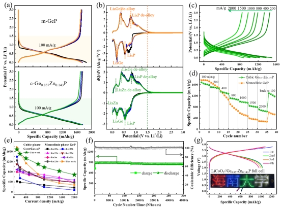 图5. 比较单斜相GeP和立方相Ge1−xZnxP的充放电曲线(a),dQ/dV图谱(b),倍率性能(c-e);Ge1−xZnxP的循环稳定性(f)和在LiCoO2//Ge1−xZnxP全电池(g)中的应用。