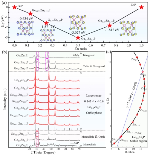 图3. 不同Zn固溶比例下系列Ge1−xZnxP固溶体的计算形成能(a),XRD图谱(b)及阳离子势(c)。