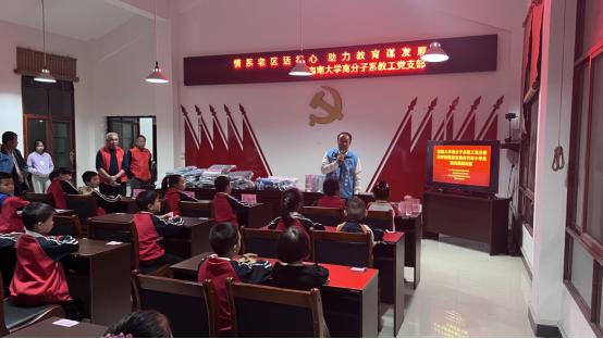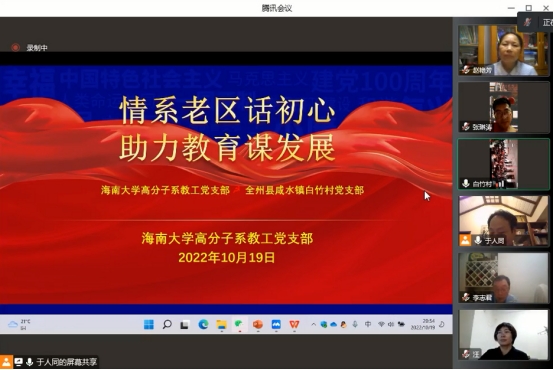 2022年10月19日,材料科学与工程学院高分子系教工党支部与广西壮族自治区全州县(湘江战役所在地)咸水镇白竹村党支部结对共建,通过线上线下相结合的形式开展了以“情系老区话初心,助力教育谋发展”为主题的助学捐赠暨白竹村小学生知识竞赛活动。